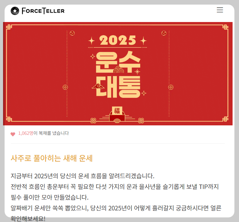 안녕하세요! 새해가 다가오면서 설렘과 함께 "이번 해는 어떤 기운이 나를 둘러쌀까?"라는 기대감도 커지고 있죠. 저도 같은 마음으로 여러 무료 운세 사이트를 둘러보고 직접 운세를 확인해 보았는데요, 오늘은 제가 경험한 솔직한 후기와 함께 을사년(乙巳年)에 담긴 기운에 대해 이야기해 보려고 합니다.
