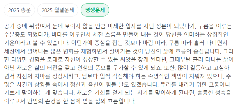 이 서비스는 특히 큰 결정을 앞둔 분들에게 추천합니다. 결혼, 이직, 창업 등 중요한 시기에 심층적인 운세 분석을 통해 방향성을 찾는 데 큰 도움이 될 것 같았는데요. 특히 일반 운세 뿐 아니라 나의 사주팔자까지 분석을 자세히 해주었기에 더욱 신뢰가 갔기에 추천드립니다.