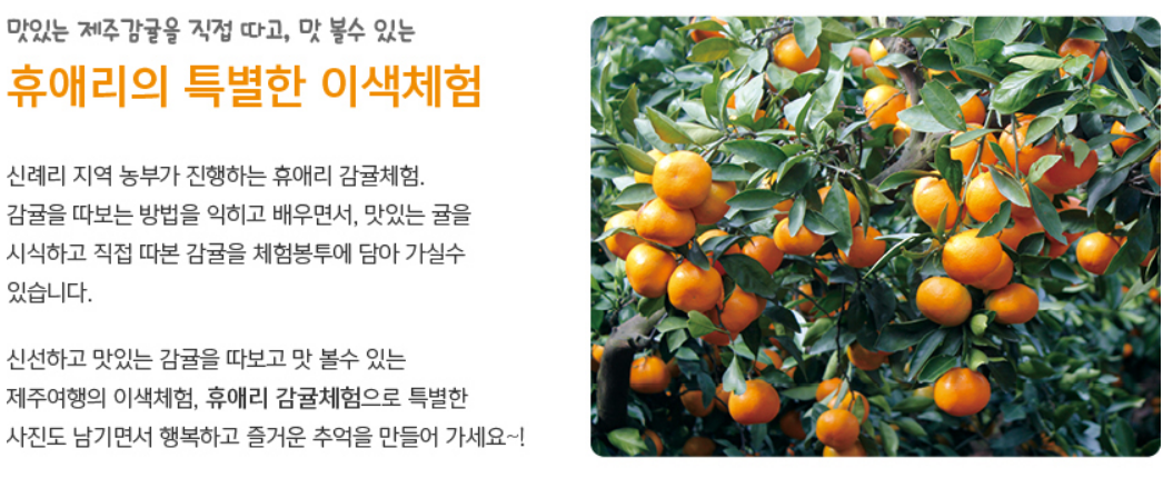 휴애리에서는 직접 감귤을 따고, 갓 딴 감귤의 신선함을 맛볼 수 있는 체험이 진행됩니다. 아이부터 어른까지 모두가 즐길 수 있어 가족 여행 코스로도 딱이에요.